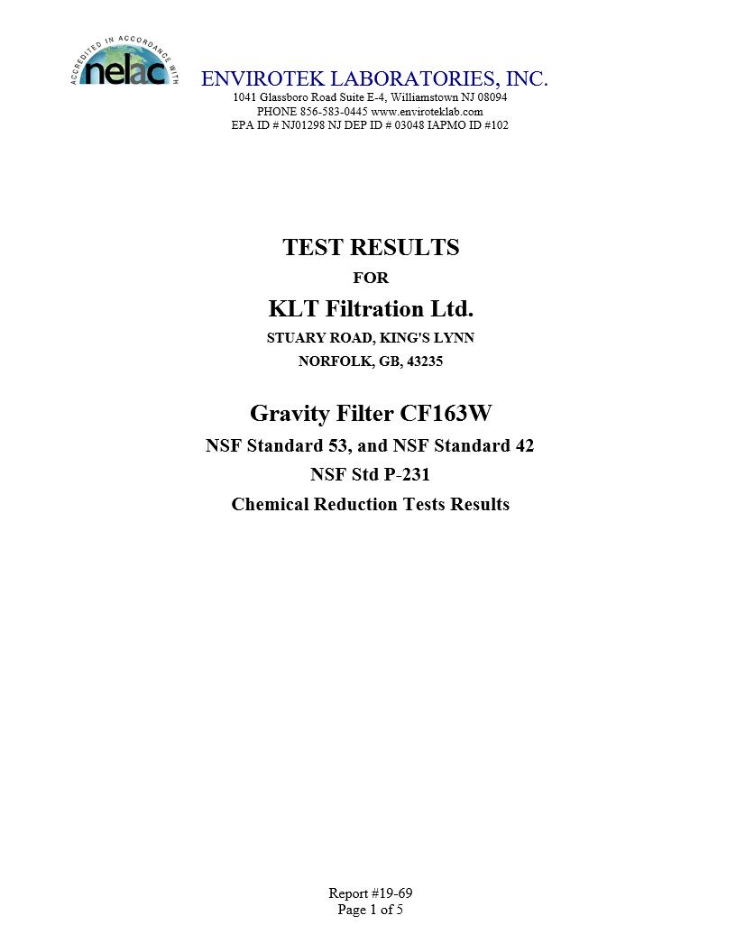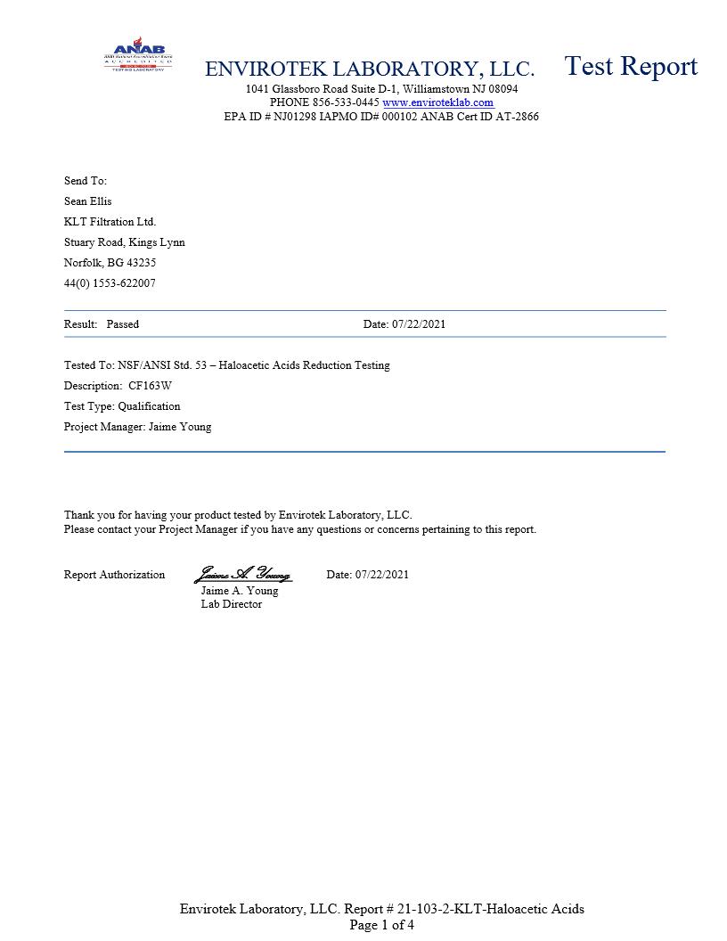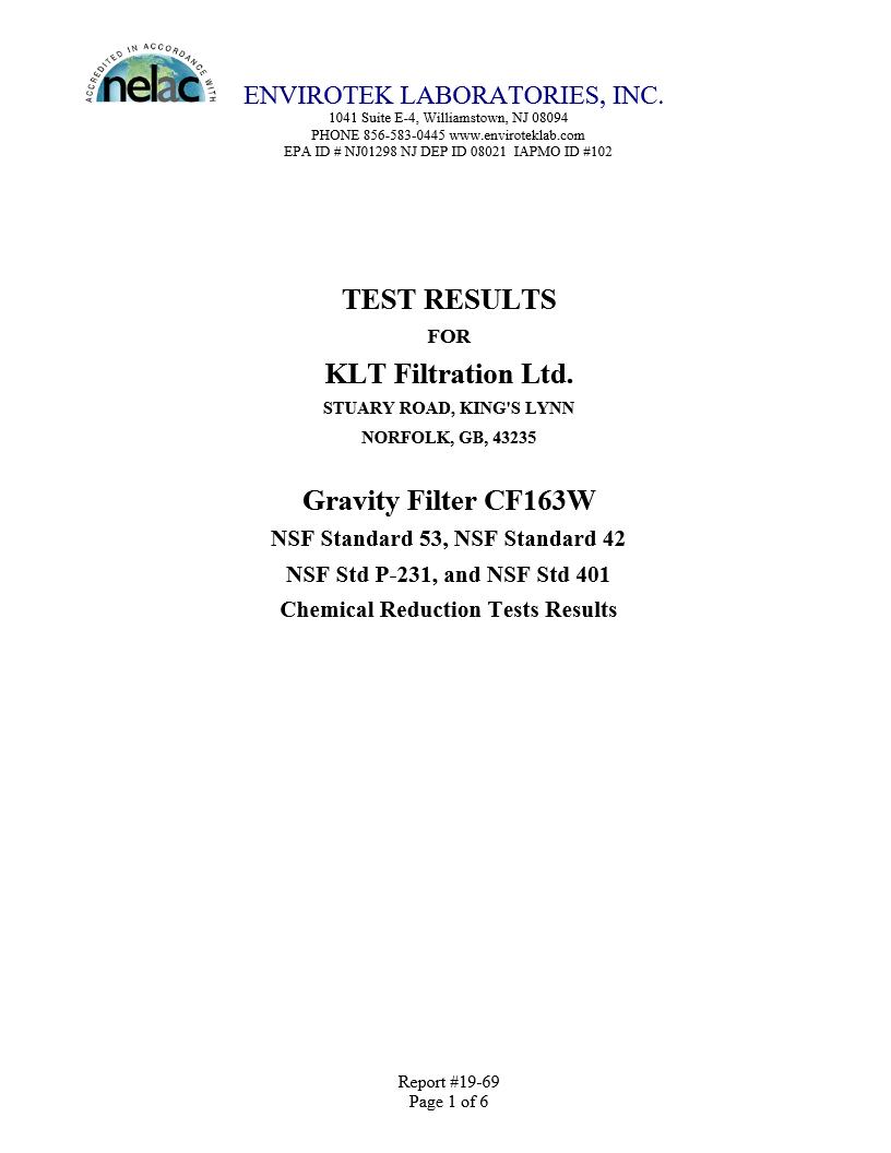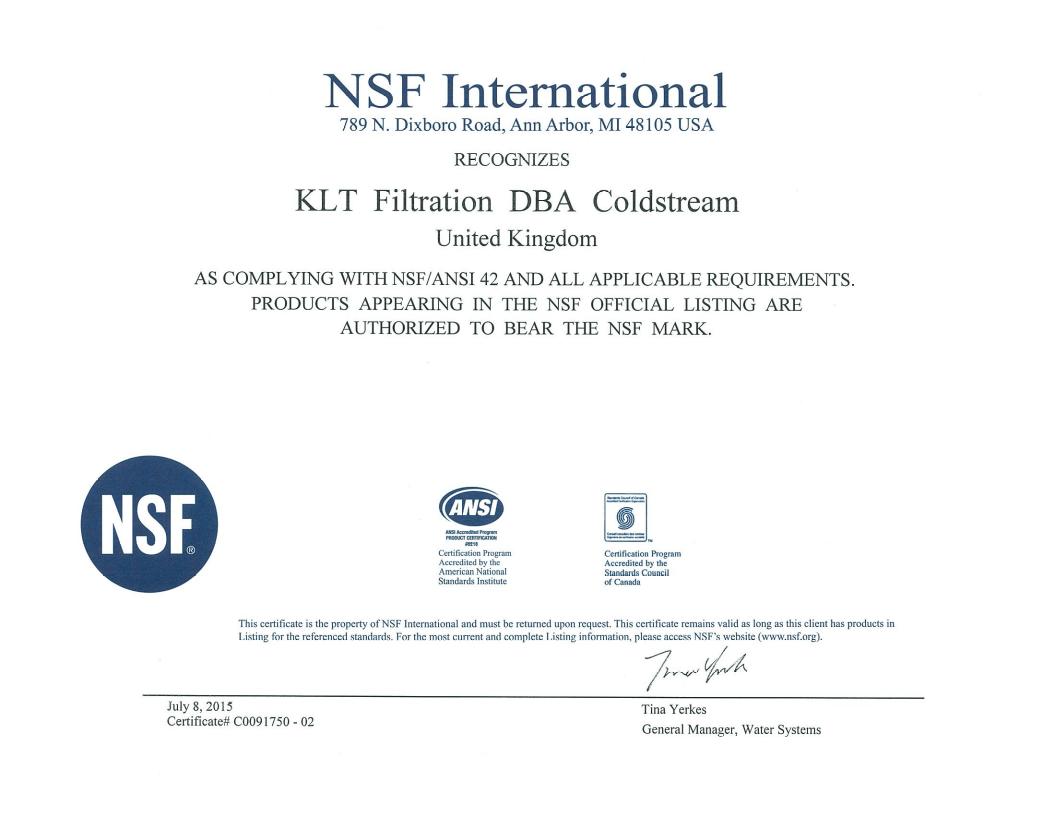 Les tests sont effectués selon les normes NSF/ANSI 42, 53 et P231 par Envirotek Inc, New Jersey USA, EPA ID # NJ01298 NJ.